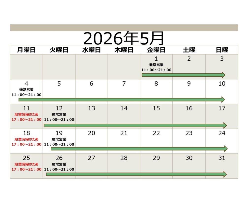 5月の日帰り温泉営業時間につきましてお知らせいたします。